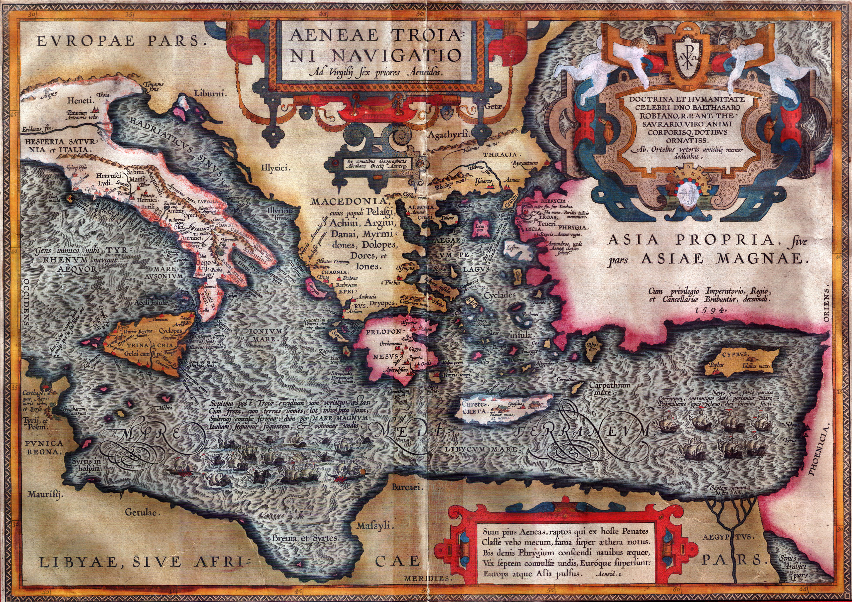 | Description: | Al verso : Texto impreso "Aeneae navigatio, ex Virgilio : additis etiam que ad eandem pertinebant, ex aliis" Cartelas en el mapa Ejemplar enmarcado Forma parte de la obra Theatrum orbis terrarum Representación pictórica del relieve |