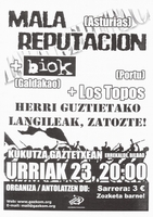 | Título: | Mala Reputación (Asturias) + Biok (Galdakao) + Los Topos (Portu) [Material grafikoa] : herri guztietatko langileak, zatozte! : Kukutza Gaztetxean Errekalde, Bilbao : urriak 23 |