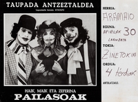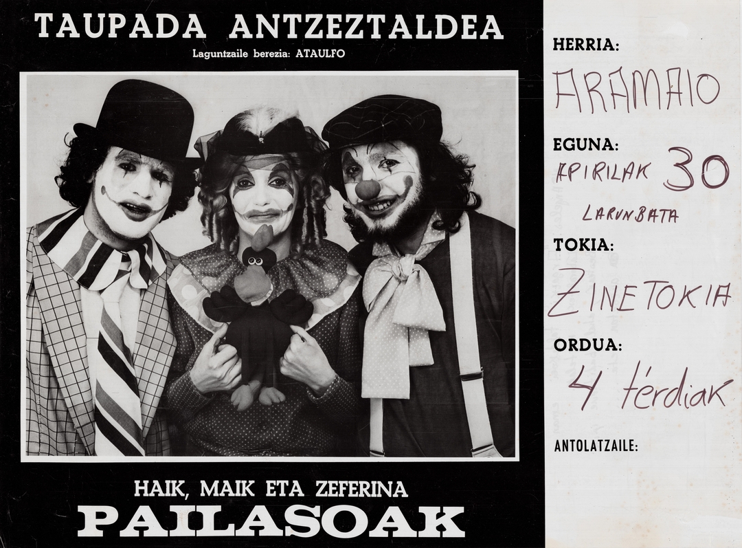 | Título: | Taupada Antzeztaldea [Material grafikoa] : Haik, Maik eta Zeferina pailasoak : herria, Aramaio : eguna, apirilak 30 larunbata : tokia, Zinetokia : orduak, 4 t'erdiak |
