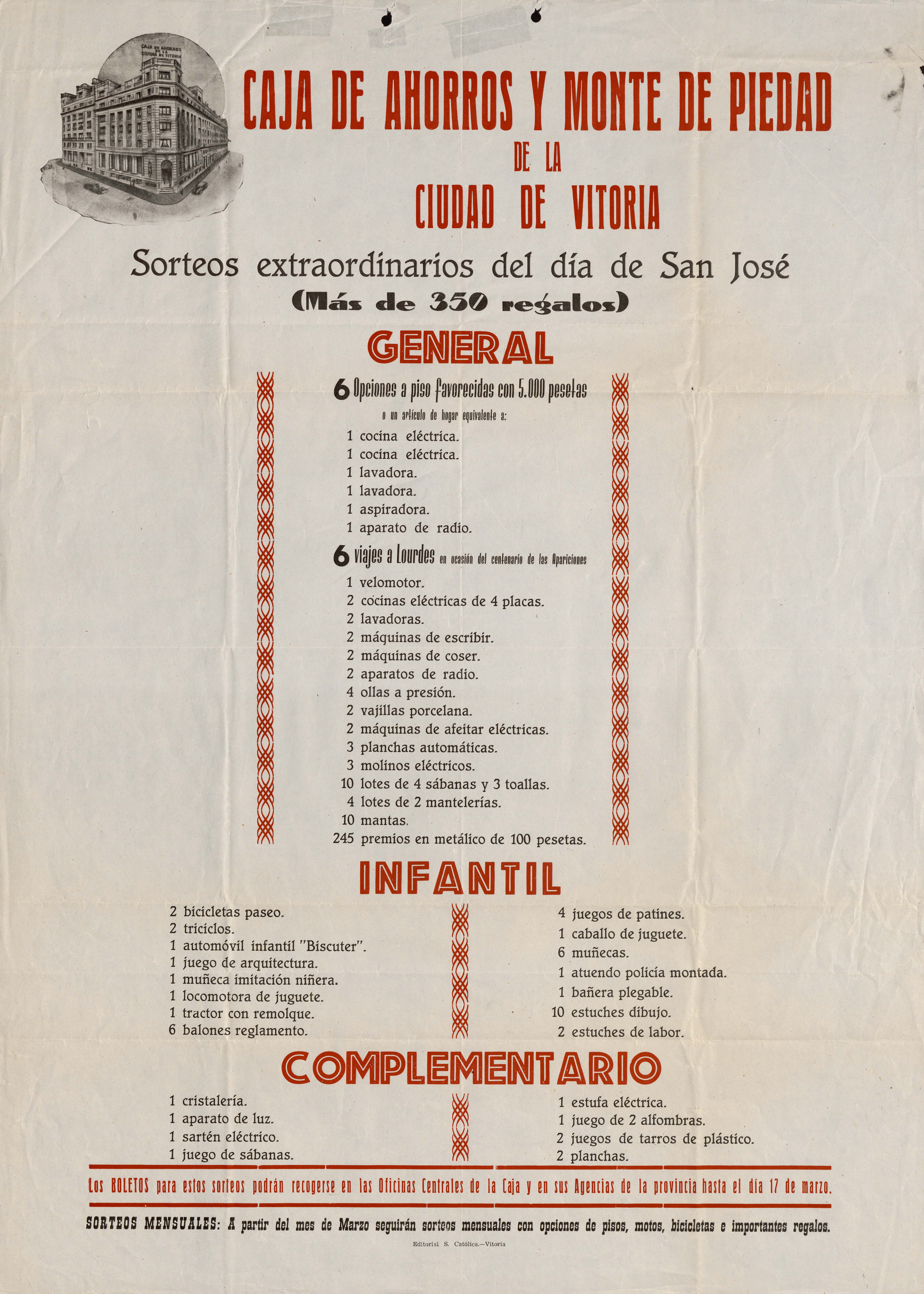 Título: Caja de Ahorros y Monte de Piedad de la Ciudad de Vitoria [Material gráfico] : sorteos extraordinarios del día de San José : (más de 350 regalos)...