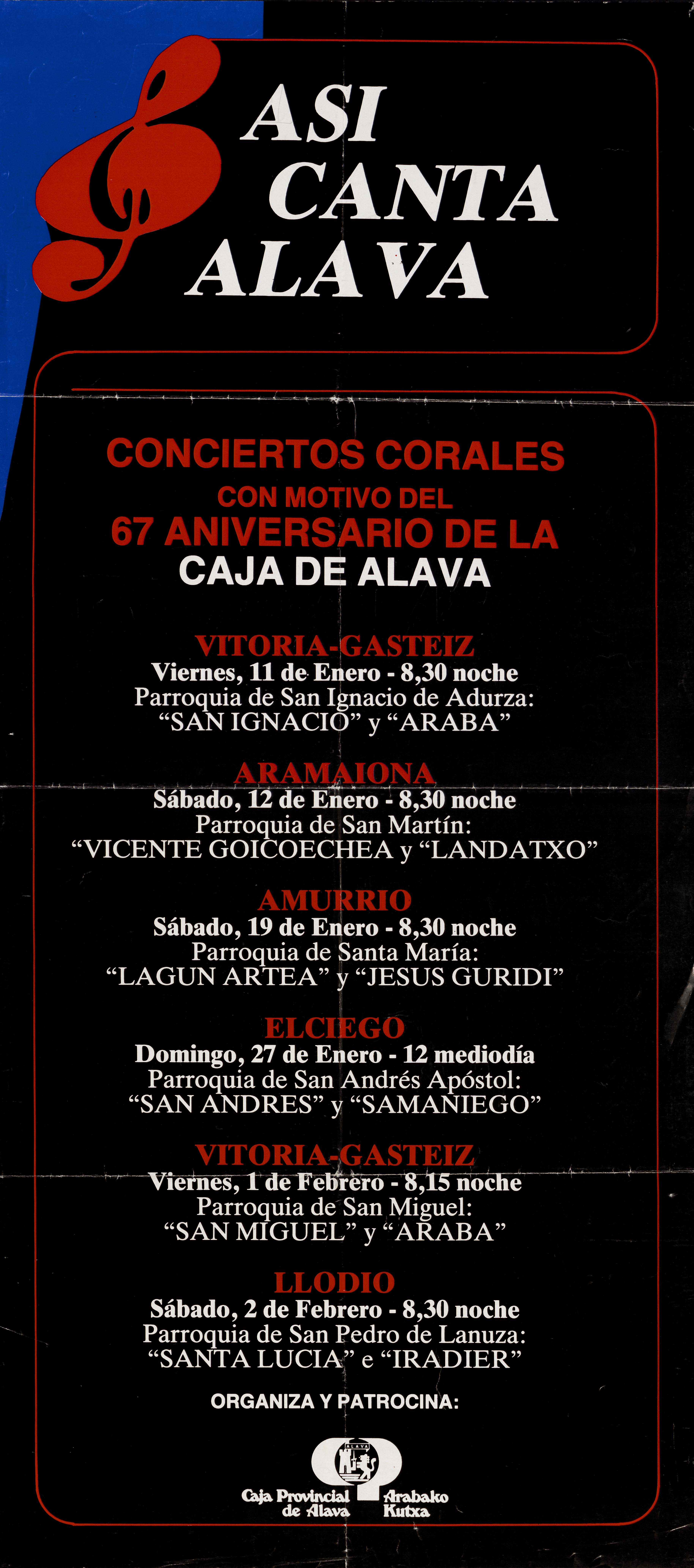 | Título: | Así canta Álava [Material gráfico] : conciertos corales con motivo del 67 aniversario de la Caja de Álava. |