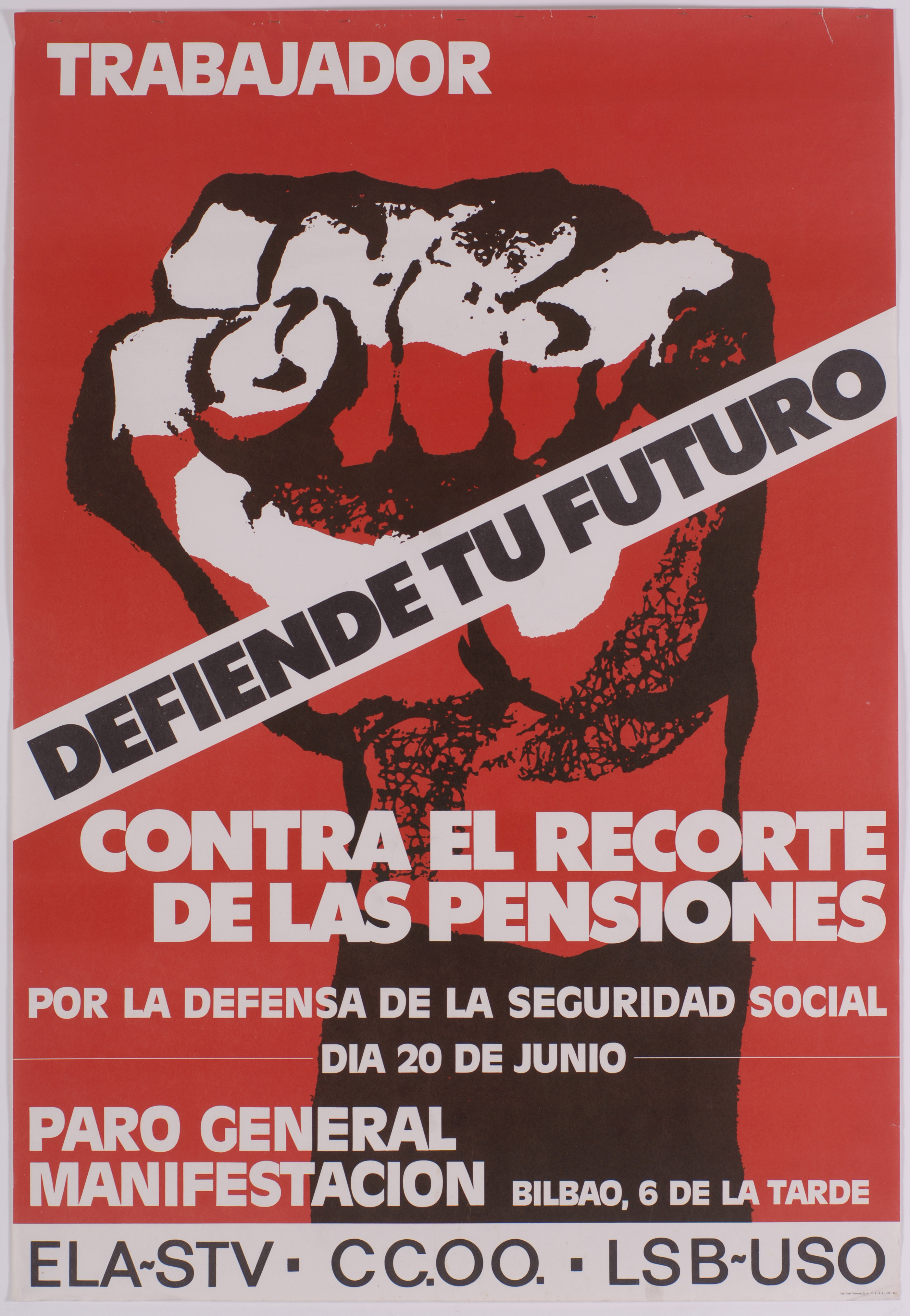 | Título: | Trabajador [Material gráfico] : defiende tu futuro : contra el recorte de las pensiones, por la defensa de la Seguridad Social : día 20 de Junio paro general : manifestación : Bilbao, 6 de la tarde : ELA-STV, CC.OO., LSB-USO. |