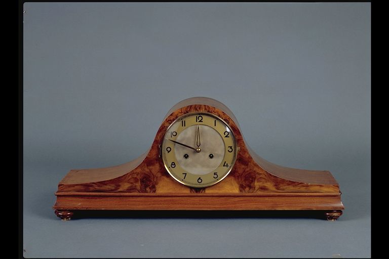 Caja de madera de nogal. Tiene sonería ( horas y medias horas) Forma clásica inglesa. Su esfera redonda lleva números arábigos. Trabajo continental siglo XX
