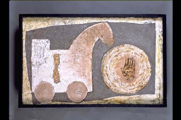 | Resumen: | Certamen de Arte Alavés Técnica: Mixta Materia-soporte: Tejido-saco Fecha de ejecución: 1989 Representación simbólica, alusiva al mundo, a la guerra y la paz. Realizada con técnica y figuración arcaizantes que recuerdan a las culturas clásicas, por su textura y también por su simplicidad figurativa. El cuadro tiene el peso de una escultura a pesar de que apenas se ha sugerido un bajorrelieve. La simplificación recuerda vagamente a las arquitecturas clásicas. |