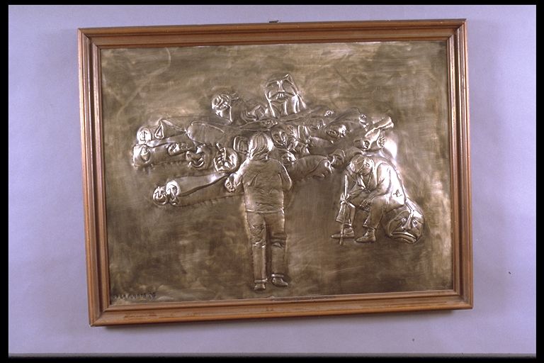 | Resumen: | Técnica: Repujado Materia-soporte: Chapa-Hierro Fecha de ejecución: 1985. Serie de personajes embutidos en relieve saliente en la chapa. Firmado y fechado en ángulo inferior izquierdo. |