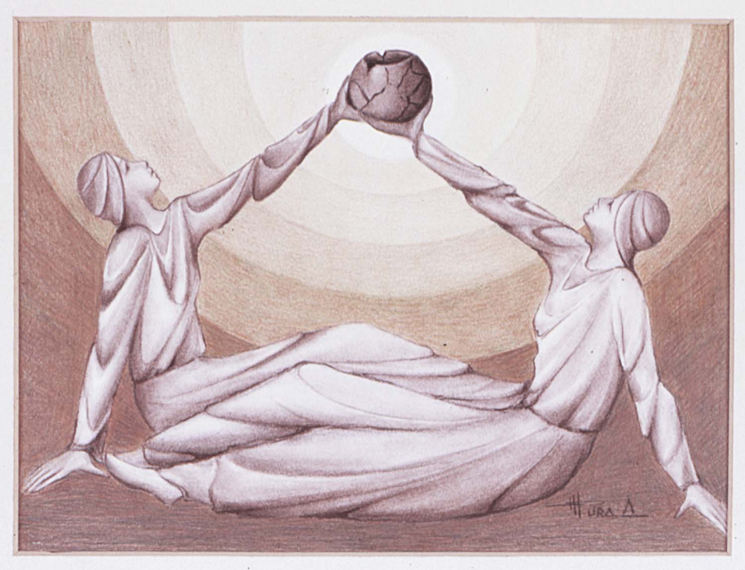 Dos figuras femeninas sentadas, una frente a la otra, sostienen una esfera resquebrajada.