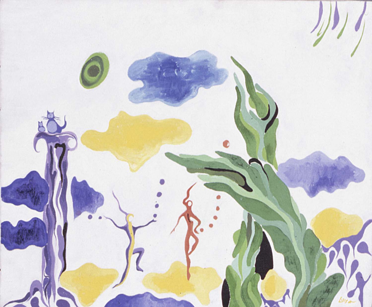 Columna con dos gatos, dos danzantes, nubes y vegetación sobre fondo blanco.