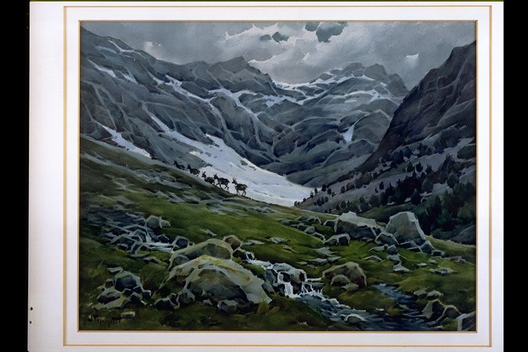 | Resumen: | Exposición Técnica: Acuarela Materia-soporte: Papel Fecha de ejecución: 1988 Paisaje montañoso con nieve y rebaño de cabras subiendo una ladera. Firmado en ángulo inferior izquierdo. |