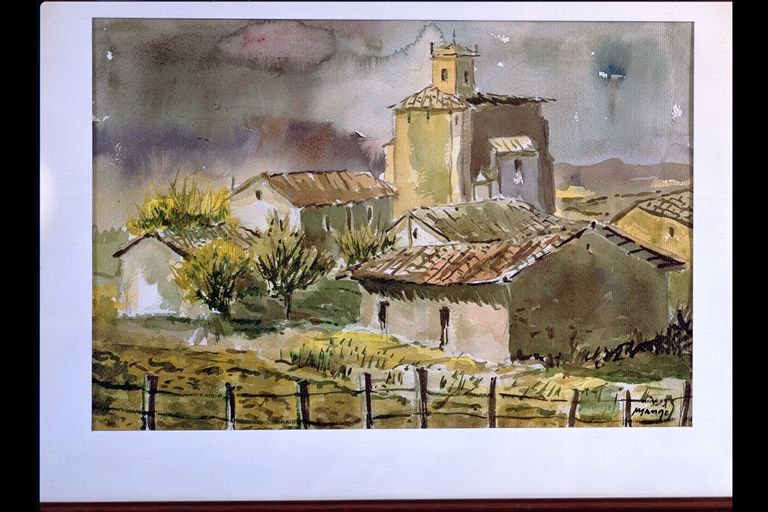 Paisaje de pueblo alavés con la iglesia en el centro.