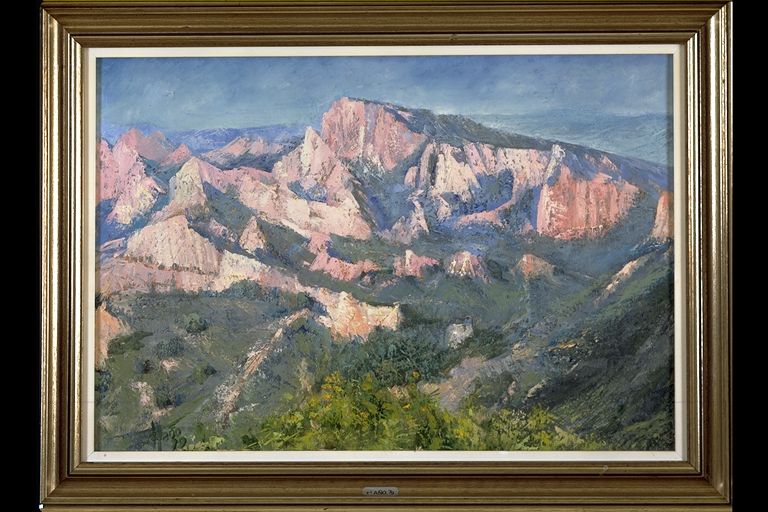 Paisaje de montaña con cortes rocosos y zonas verdes.