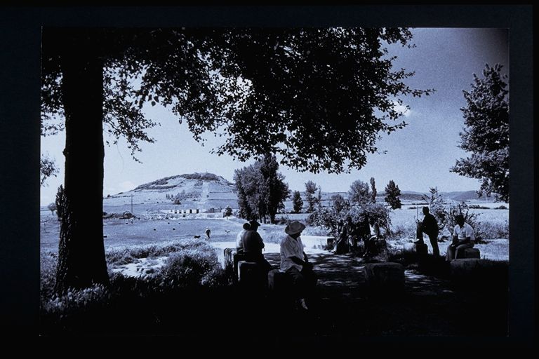 La fotografía presenta un extremo de la campa de Olárizu a cuyo fondo se observa el monte del mismo nombre. Destaca el contraste que proporciona en primer término, donde se cobijan, la sombra de un árbol, los personajes y los términos iluminados al fondo.