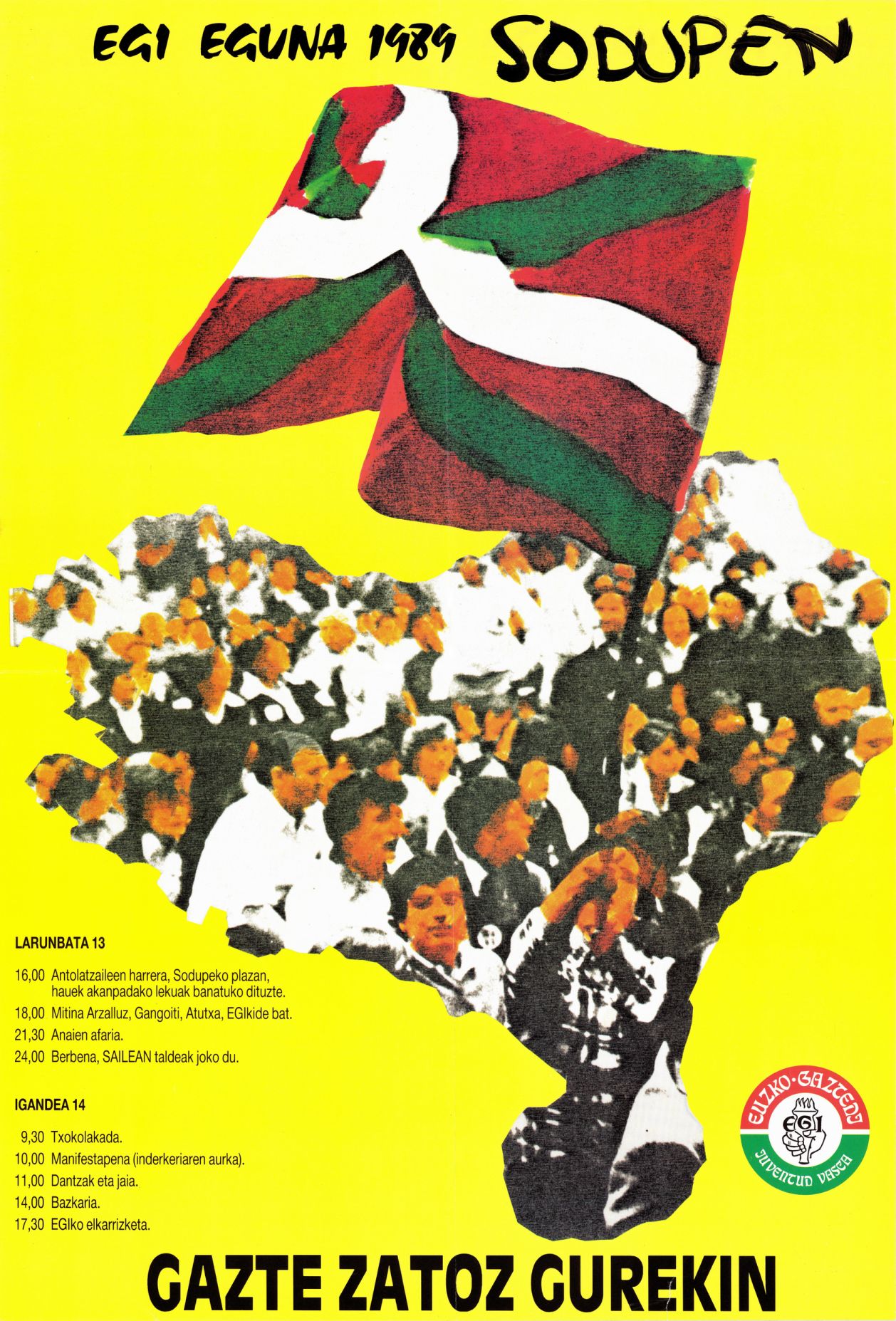 Título: EGI eguna 1989 [Material gráfico] : gazte zatoz gurekin : Sodupen larunbata 13, 16'00 antolaitzaileen harrera, Sodupeko plazan,... : Juventud Vasca EGI, Euzko-Gaztedi