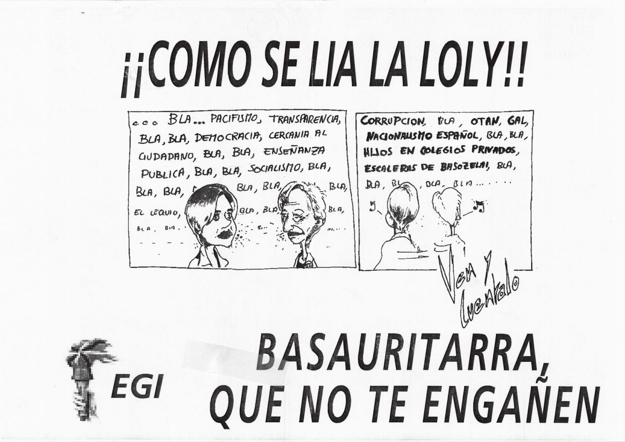 | Título: | ¡¡Como se lía la Loly!! [Material gráfico] : __ bla__ pacifismo, tranparencia,... corrupción, bla, OTAN, GAL, nacionalismo español, bla, bla,... : basauritarra, que no te engañen, ven y cuéntalo |