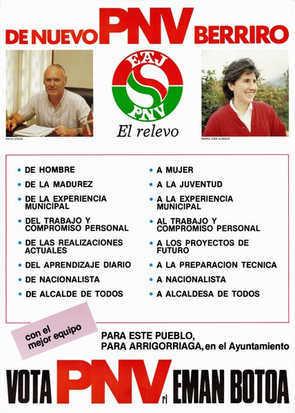 Título: De nuevo PNV [Material gráfico] : berriro EAJ-PNV : Patxi Otxoa el relevo de hombre, de la madurez... a María José Albizua, a mujer, a la juventud... : con el mejor equipo para este pueblo, para Arrigorriaga : en el ayuntamiento vota PNVri eman botoa