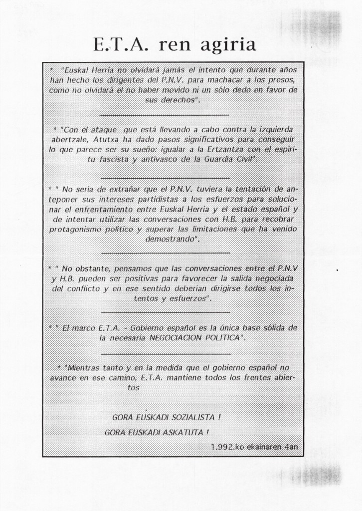 Título: E.T.A.ren agiria [Material gráfico] : "Euskal Herria no olvidará jamás el intento que durante años han hecho los dirigentes del P.N.V. para machacar a los presos..." : gora Euskadi sozialista! gora Euskadi askatuta!, 1.992.ko ekainaren 4an