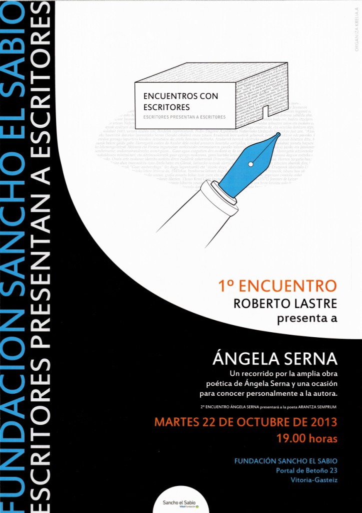 Título: Escritores presentan a escritores [Material gráfico] : encuentros con escritores : 1o encuentro Roberto Lastre presenta a Ángela Serna... martes 22 de octubre de 2013, 19.00 horas, Fundación Sancho el Sabio, Portal de Betoño 23, Vitoria-Gasteiz / [diseño de Mikel Escalera] ; [organiza] Fundación Sancho el Sabio