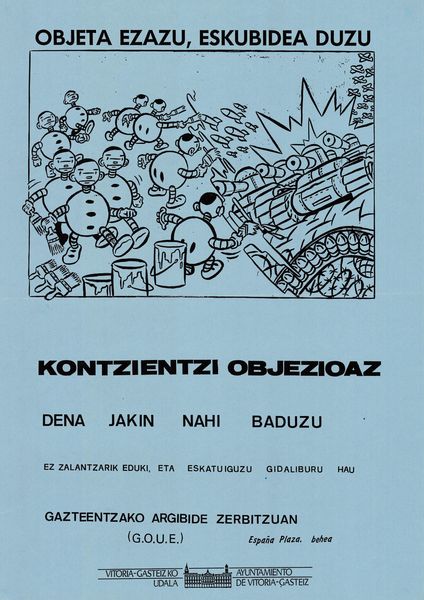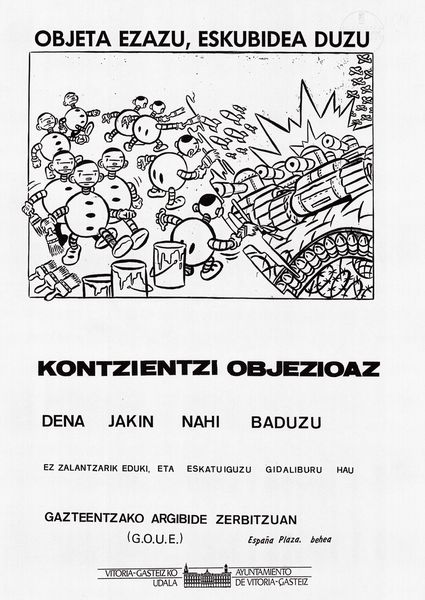 | Título: | Objeta ezazu, eskubidea duzu [Material gráfico] : kontzientzi objezioaz : dena jakin nahi baduzu ez zalantzarik eduki, eta eskatuiguzu gidaliburu hau Gazteentzako Argibide Zerbitzuan (G.O.U.E), España Plaza, behea |