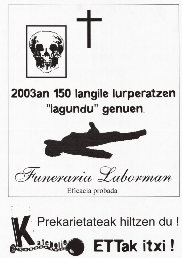 Título: 2003an 150 langile lurperatzen "lagundu" genuen [Material gráfico] : Funeraria Laborman, eficacia probada : prekarietateak hiltzen du! : ETTak itxi!