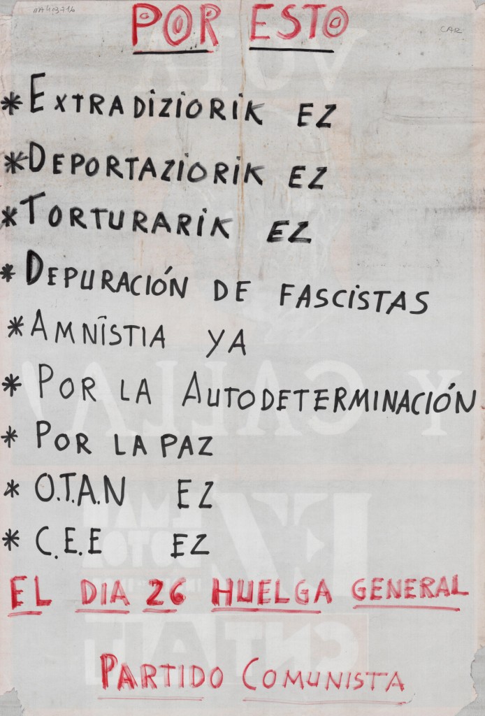 | Título: | Por ésto [Material gráfico] : extradiziorik ez, deportaziorik ez, torturarik ez, depuración de fascistas, amnistía ya, por la autodeterminación, por la paz, O.T.A.N. ez, C.E.E. ez : el día 26 huelga general : Partido Comunista |