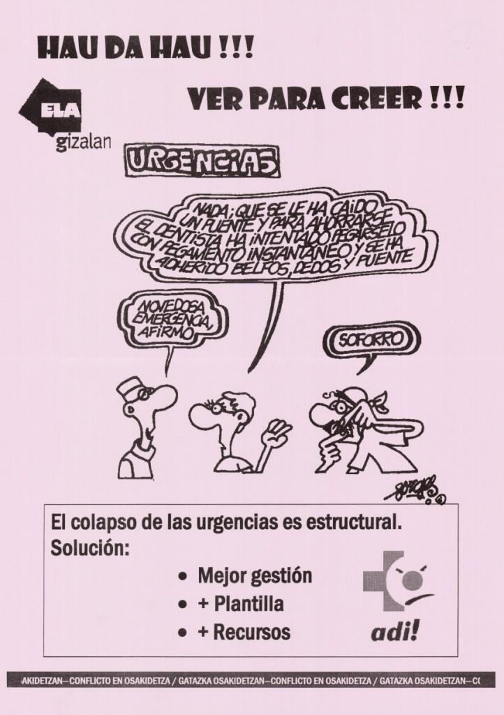 | Título: | Hau da hau!!! [Material gráfico] = Ver para creer!!! : conflicto en Osakidetza, el colapso de las urgencias es estructural : solución : mejor gestión + plantilla + recursos |