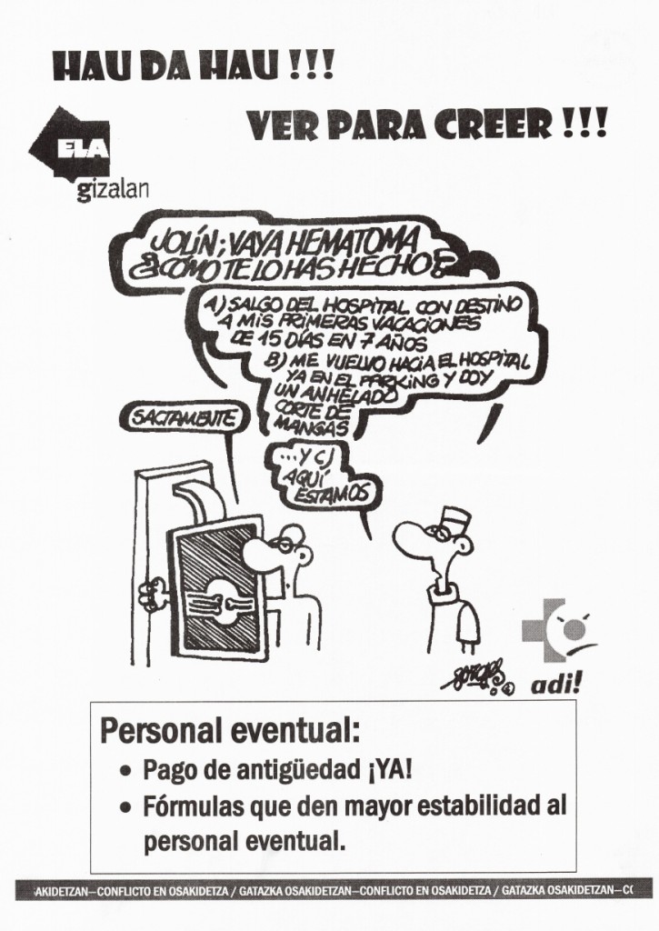 | Título: | Hau da Hau!!! [Material gráfico] = Ver para creer!!! : conflicto en Osakidetza : personal eventual : pago de antigüedad ¡ya! : fórmulas que den mayor estabilidad al personal eventual |