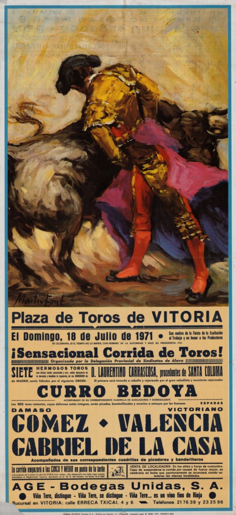 Título: Plaza de Toros de Vitoria [Material gráfico] : domingo 18 de julio : con motivo de la Fiesta de la Exaltación al Trabajo y en Honor a los Productores, sensacional corrida de toros, siete hermosos toros : C. Bedoya, D. Gómez, Víctoriano Valencia, Gabriel de la Casa