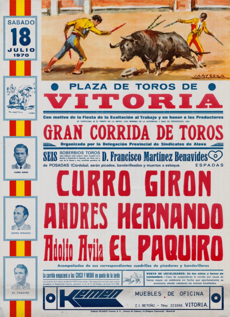 Título: Plaza de Toros de Vitoria [Material gráfico] : gran corrida de toros con motivo de la Fiesta de Exaltación al Trabajo y en honor a los Productores : Curro Girón, Andrçes Hernando, El Paquiro...