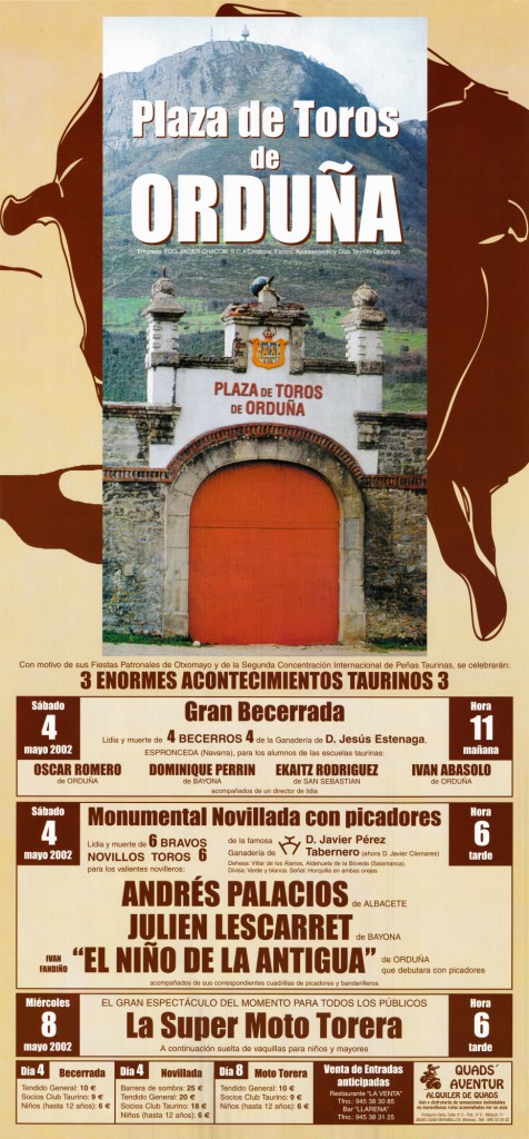 Resumen: Fco. Javier Chacón, S.C. Club Taurino Otxomayo. Alumnos de la escuela taurina, Oscar Romero, Dominique Perrin, Ekaitz Rodríguez y Iván Abasolo. Novilleros: Andrés Palacios, Julien Lescarret y "El niño de la Antigua" Incluye fotografía de la plaza de toros de Orduña