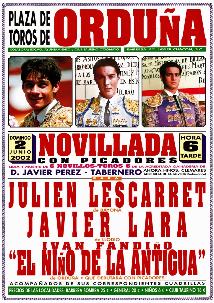 Título: Plaza de Toros de Orduña [Material gráfico] : novillada con picadores : Julien Lescarret, Javier Lara, Ivan Fandiño "El Niño de la Antigua"