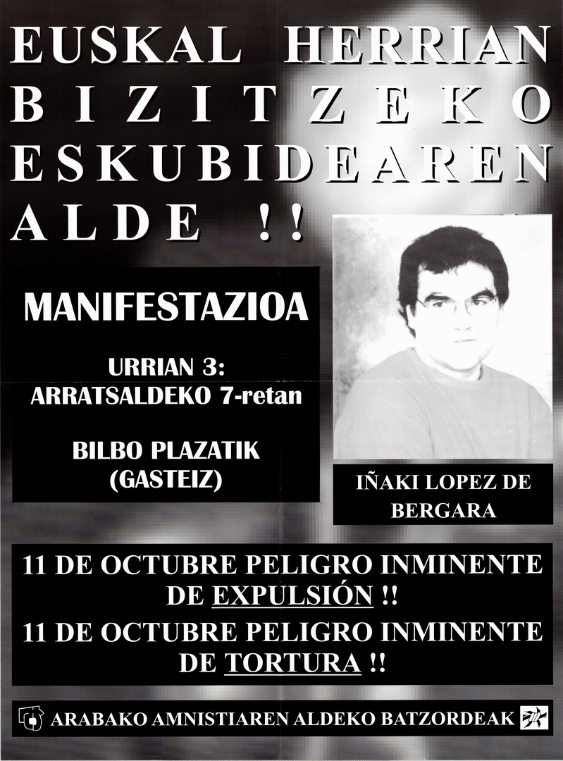 Título: Euskal Herrian bizitzeko eskubidearen alde!! [Material gráfico] : manifestazioa urrian 3, arratsaldeko 7-retan Bilbo Plazatik (Gasteiz) : Iñaki López de Bergara : 11 de octubre peligro inminente de expulsión!! : 11 de octubre peligro inminente de tortura!!