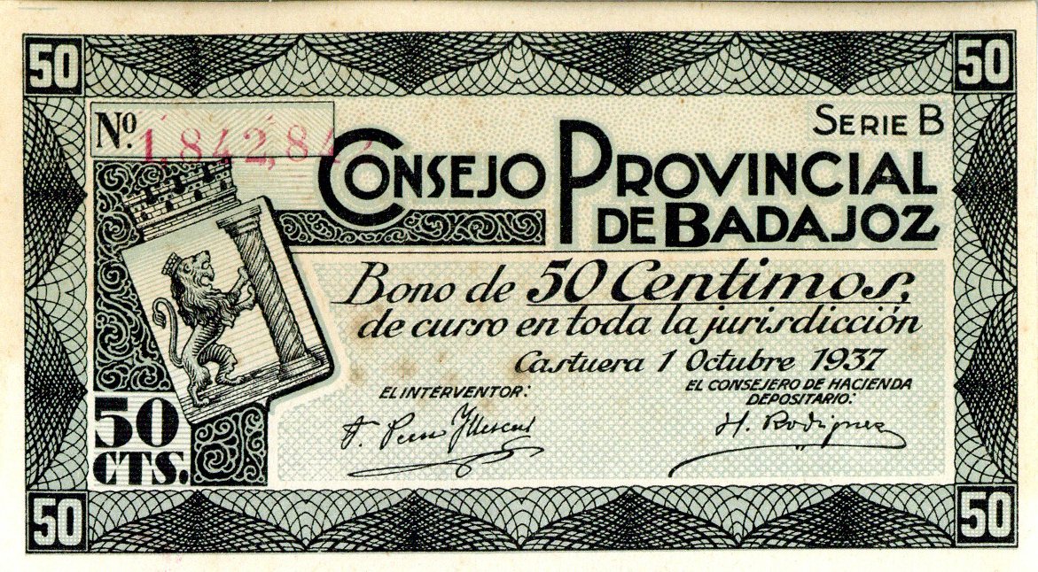 | Resumen: | Bono de 50 céntimos emitido por el Consejo Provincial de Badajoz, en Castuera (Badajoz), 1 octubre 1937. Nº serie: 1,842,842. Serie B.
