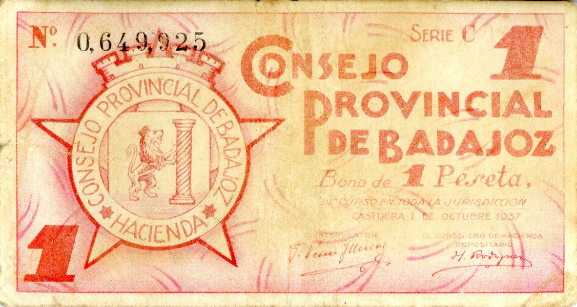 Resumen: Bono emitido por el Consejo Provincial de Badajoz. 1 peseta. 1937. Nº serie: 0,649,925 Serie C.