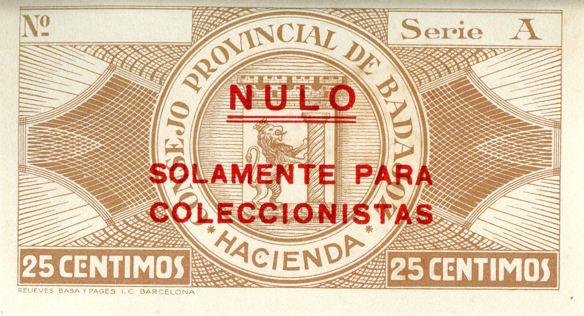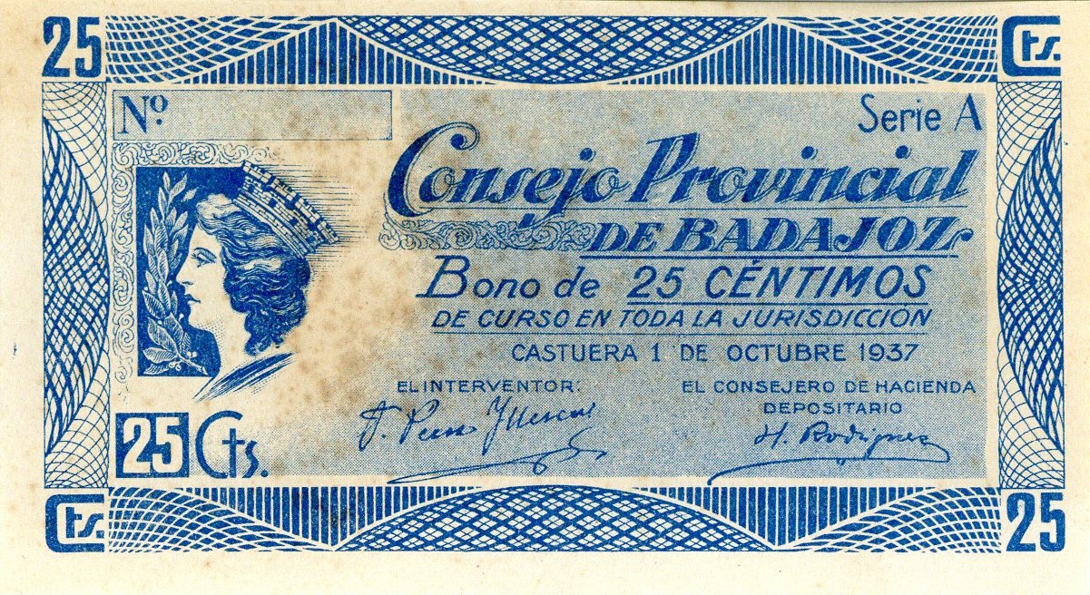 Resumen: Bono emitido en Castuera por el Consejo Provincial de Badajoz. 25 céntimos. 1937. Sin número de serie. Serie A.