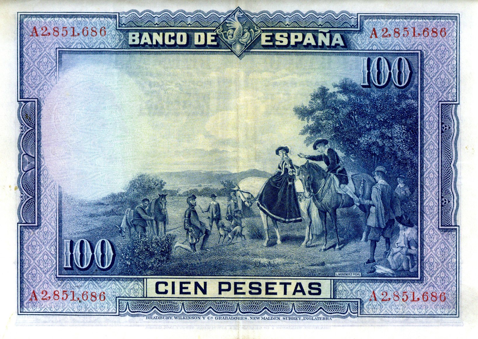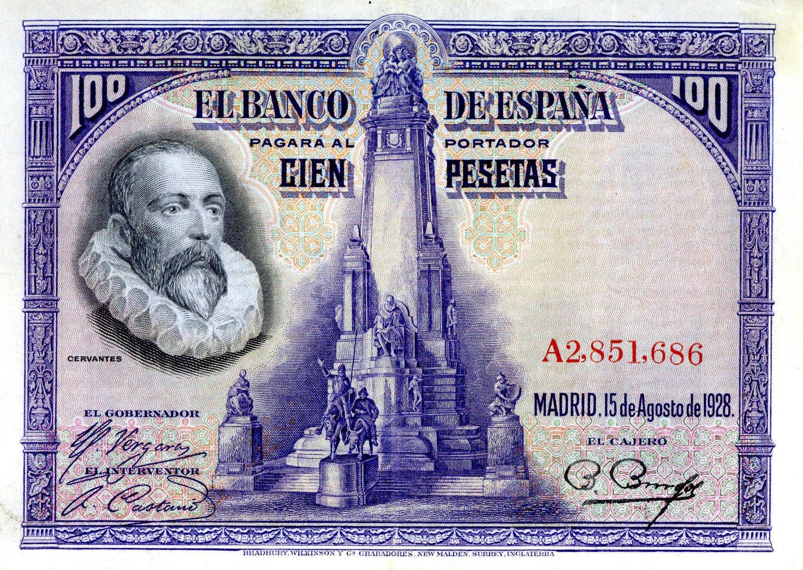 | Resumen: | Billete de cien pesetas emitido por el Banco de España el 15 de agosto de 1928 (a pesar de que fue encargado y fabricado bajo el reinado de Alfonso XIII, comenzó a circular cuando ya estaba instaurada en España la II República). Fabricado en tipografía y calcografía por la casa "Bradbury" de Londres.