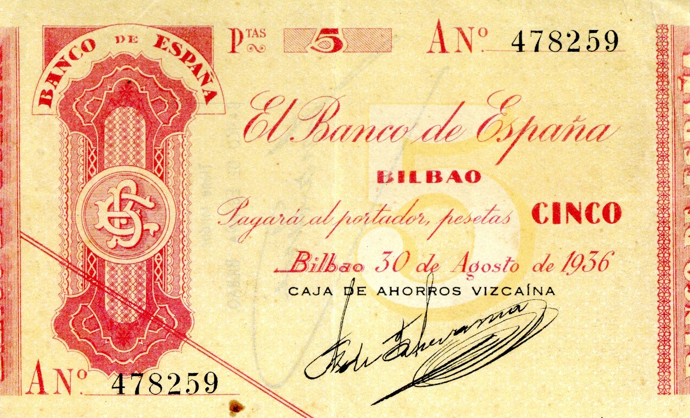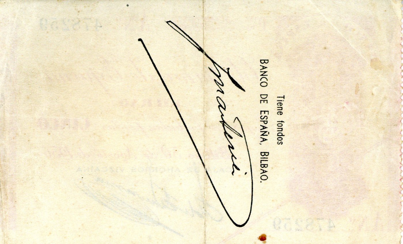 Billete emitido por orden del Departamento de Hacienda del Gobierno de Euzkadi durante la Guerra Civil Española (1936-1939) . En agosto de 1936, la Junta de Defensa de Vizcaya dispuso la emisión de talones al portador contra cuentas corrientes del Banco de España.