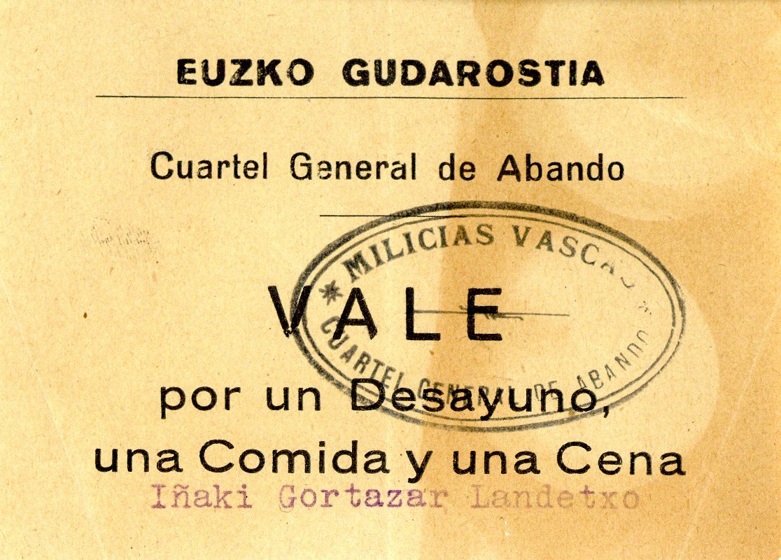 Resumen: Vale emitido por el Cuartel General de Abando del Euzko Gudarostia a nombre de Iñaki Gortázar Landetxo. S. f. Sin nº de serie. Sello de Milicias Vascas, Cuartel General de Abando.