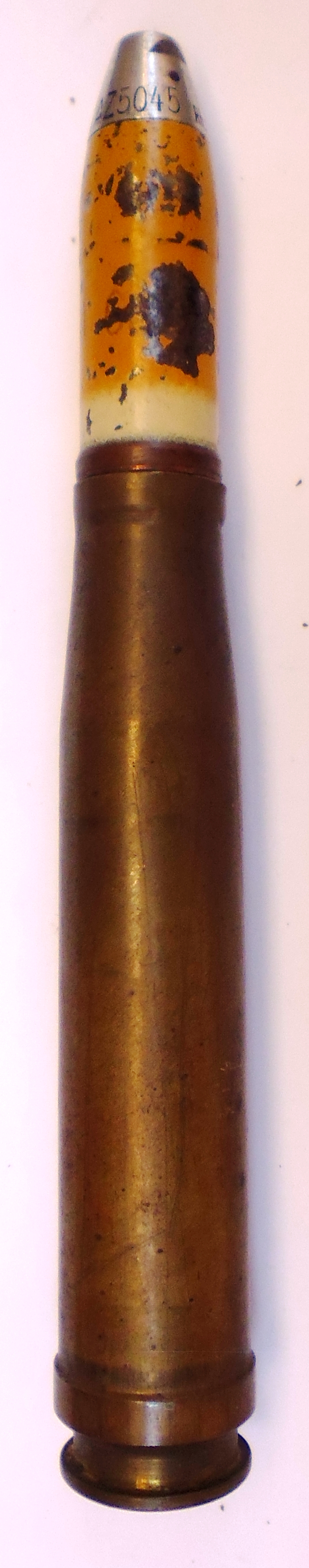 Resumen: Proyectil alemán antiaéreo 20 mm. En la ficha que acompaña: "Proyectil de ametralladora antiaérea alemana (bala blanca y amarilla)"